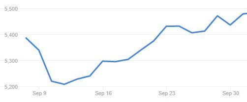 But sometimes looking at the value of a share market at two single points in time can be misleading. During the month of September, the market actually rose as high as 5,471 and fell as low as 5,207. Depending on which end you start at, this represents variance of up to 5% over the period. You can see this on the following graph (thanks to Google Finance) which is anything but a flat line: